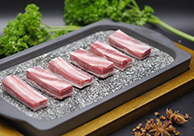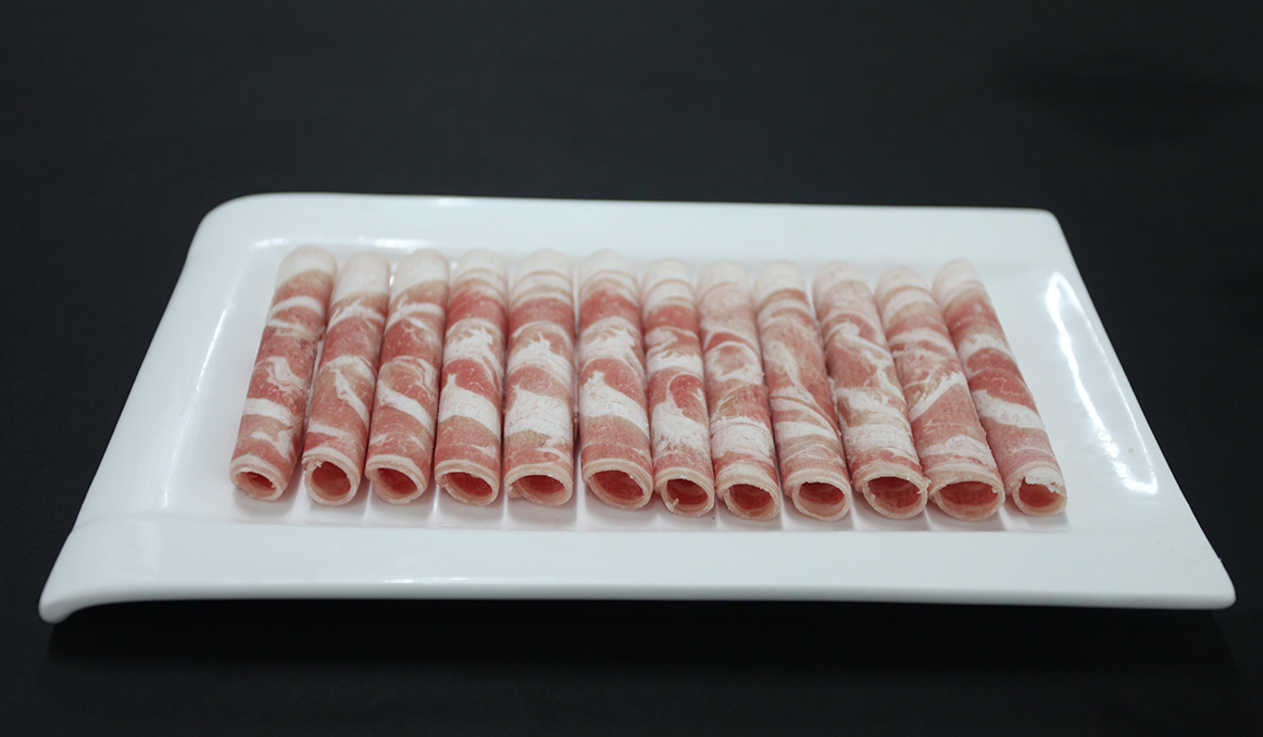 選用羔羊完整腰背連接腹部肌肉。脂肪向外,脂肪厚度0.5㎝-0.8㎝,切片后外肥里瘦,呈太陽(yáng)狀,適合涮食、煎烤。
