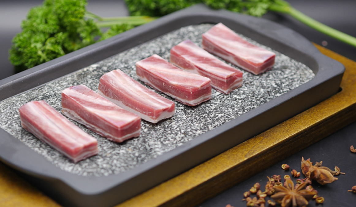 脊椎骨(7-11肋)兩側(cè)部位肉,部位肉酮體占3.6%,表面去風(fēng)干肉、淤血肉及軟硬骨,保留自然脂肪,肉質(zhì)紅白相間,呈大理石花斑紋狀,肉質(zhì)細(xì)嫩,脂肪含量較高,香甜多汁,不干澀。