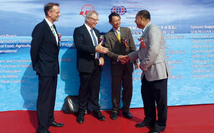 2013年10月13日,第十一屆中國(guó)(青島)國(guó)際肉類工業(yè)展覽會(huì)上,大莊園集團(tuán)董事長(zhǎng)陳希濱與世界肉類組織主席阿圖羅·拉瓦洛友好交談。