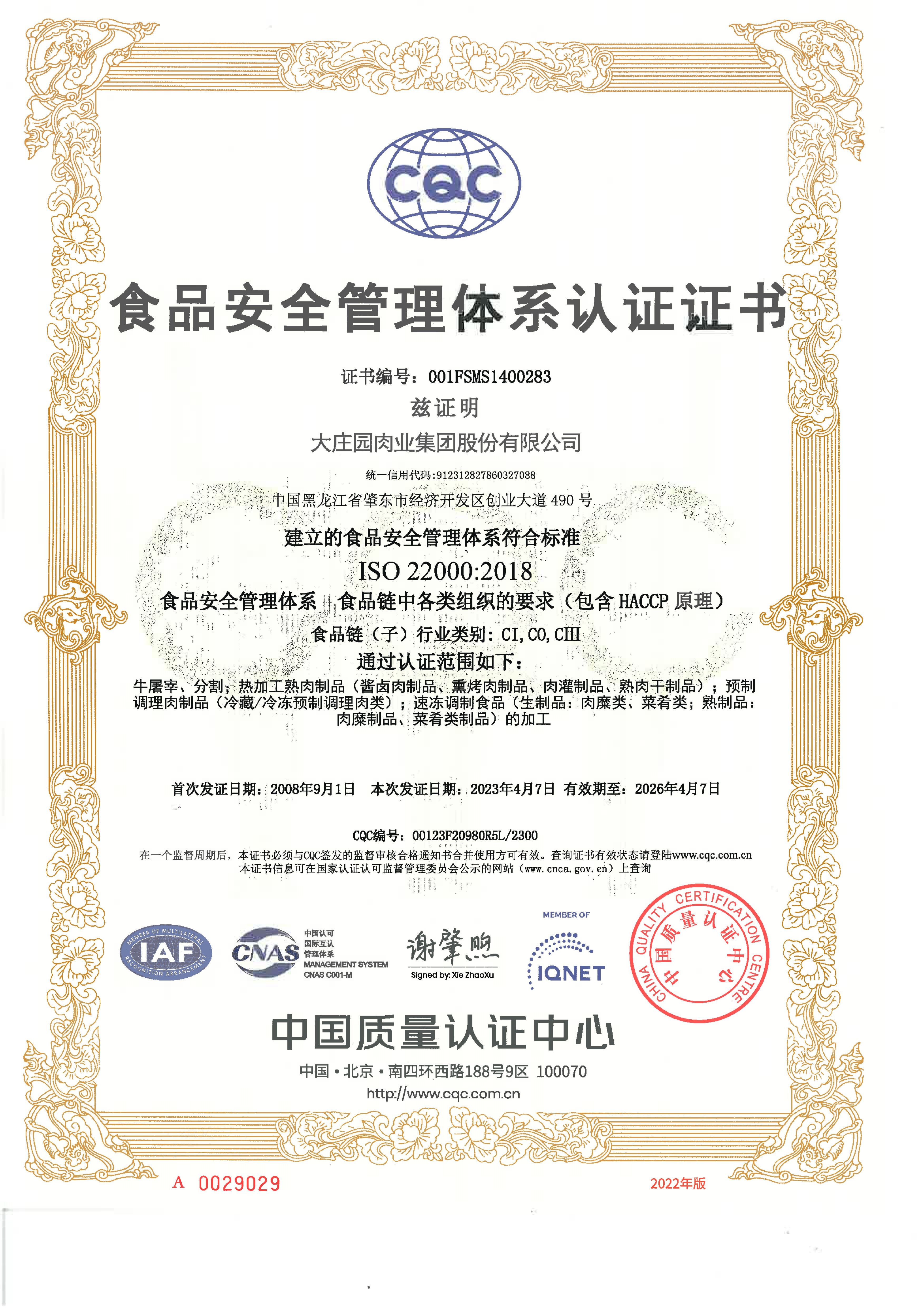 食品安全管理體系認(rèn)證證書(ISO22000)中文