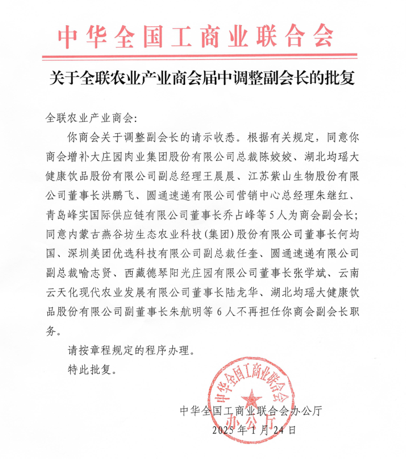 在大會正式召開之前,全國工商聯(lián)農(nóng)業(yè)產(chǎn)業(yè)商會還召開了第四屆第四次理事會、第七次常務(wù)理事會暨第九次會長辦公會。會議匯報(bào)了2024年商會工作情況及2025年工作計(jì)劃,并審議通過了新增及調(diào)整副會長人員名單,分支機(jī)構(gòu)成立的申請和論壇活動管理制度等事項(xiàng),并傳達(dá)全國工商聯(lián)沈瑩書記一行調(diào)研商會時(shí)的講話要點(diǎn)。大莊園集團(tuán)總裁陳姣姣當(dāng)選全國工商聯(lián)農(nóng)業(yè)產(chǎn)業(yè)商會副會長。